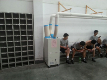 解决方案: 在员工休息区使用公司SAC-45工业冷气机,在休息位置上方做固定位冷风延长管,并间隔开孔,是冷风均匀吹到下方休息的员工处。
