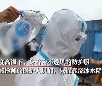 6月以来,北京市接连爆发新冠肺炎确诊病例,各个社区的检测防控工作高度紧张,奋战在抗疫一线的医护人员穿着厚重的防护服,在户外烈日下连续做着核酸检测工作。高温加上高强度的工作很是难熬,但是检测工作不能耽误,更是有人用脚踩冰块,冰水浇头来进行降温,让人看了很是心疼。